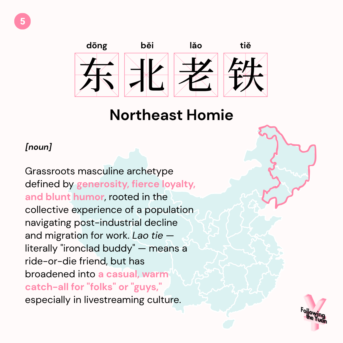 Definition: Grassroots masculine archetype characterized by generosity, unwavering loyalty, and a blunt sense of humor. This identity is often intertwined with the collective nostalgia of a population navigating post-industrial economic transition and widespread migration for work. Lao tie literally means “ironclad buddy” in Northeastern Chinese dialect — a ride-or-die friend — but has since broadened into a casual, warm-toned catch-all for “folks” or “guys,” especially in livestreaming culture.