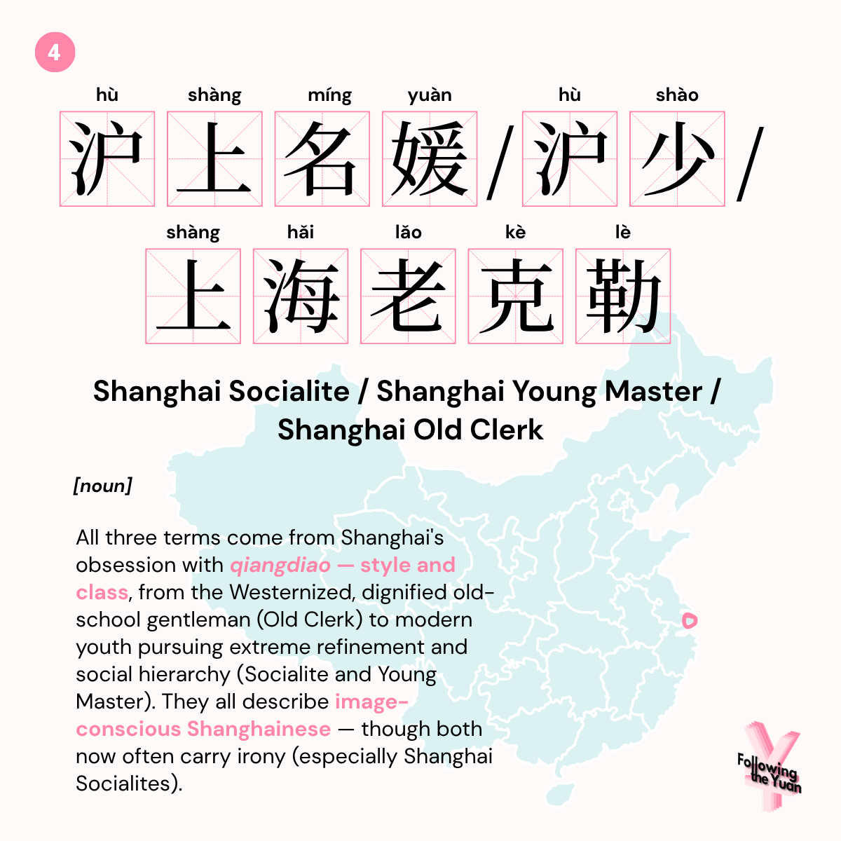 Definition: All three terms come from Shanghai’s obsession with qiangdiao — style and class, from the Westernized, dignified old-school gentleman (Old Clerk) to modern youth pursuing extreme refinement and social hierarchy (Socialite and Young Master). They all describe image-conscious, taste-driven Shanghainese — though both now often carry irony (especially Shanghai Socialites).