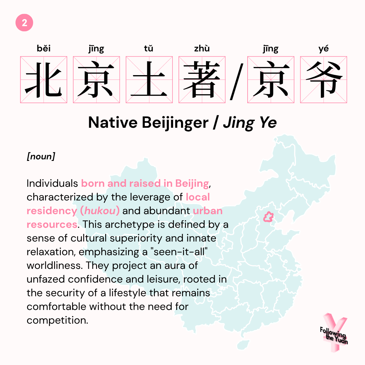 Beijing Native (北京土著): Primarily a self-identifier, this term carries a strong sense of local belonging and cultural identity. The term “Native” gained popularity in the early days of the Chinese internet (circa 2005–2010). Its original purpose was to distinguish “Old Beijingers” (multi-generational locals) from “New Beijingers” (migrants or Bei Piao).