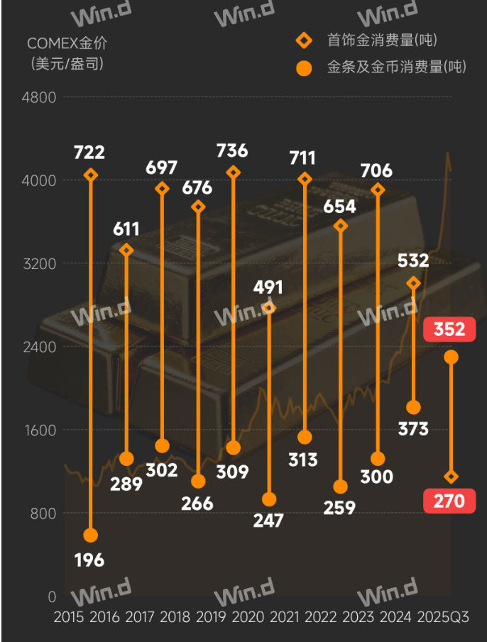 China’s total gold jewelry consumption fell 32.5% to 270.04 tons, while investment gold, such as gold bars and coins, rose 24.55% to 352.12 tons, according to data released by the China Gold Association on November 10.