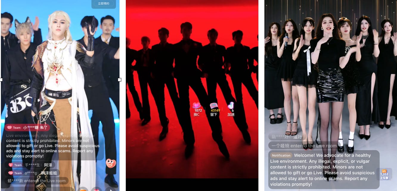 After the ‘Leg-Sweeping Dance’ went viral this summer, the average number of daily group livestreams in 2025 reached around 8,000, more than 20% higher year-on-year compared with 2024, and the revenue this year estimated to exceed 15 billion RMB, according to China Association of Performing Arts. Another viral format is five to seven girls/guys collectively give users personal compliments when they buy digital gifts.