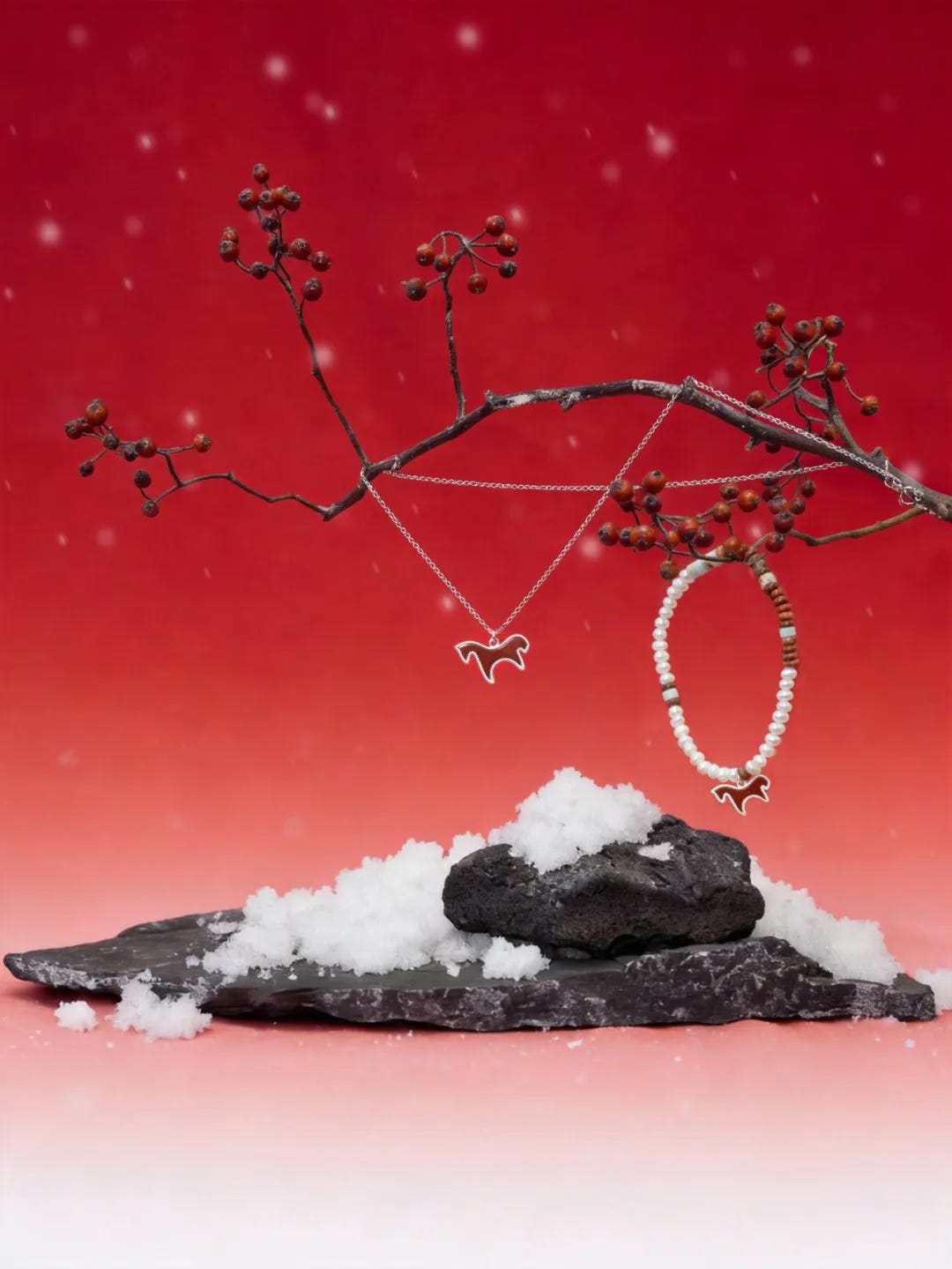 Products: Red Pony, Red Berry, and Red Bean jewelry series with horse elements combined with red stones symbolizing courage and steadfastness